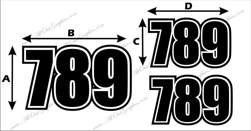 Outline Style Motorcycle Race Numbers vinyl die cut decals easy to apply 1 front decal and 2 side decals You can specific the exact sizes for all the decals Choose the size for the front and rear decals you specify the measurement for each section above